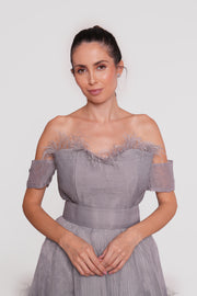 Evelyn Gray Organza Off-shoulder Corset Maxi Dress With Feathers