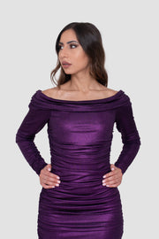Lele Purple Off-Shoulder Ruched Metallic Maxi Dress