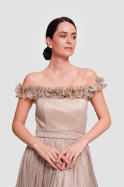 Amaan Gold Metallic Fabric Off-shoulder Corset Maxi Dress With Ruffles